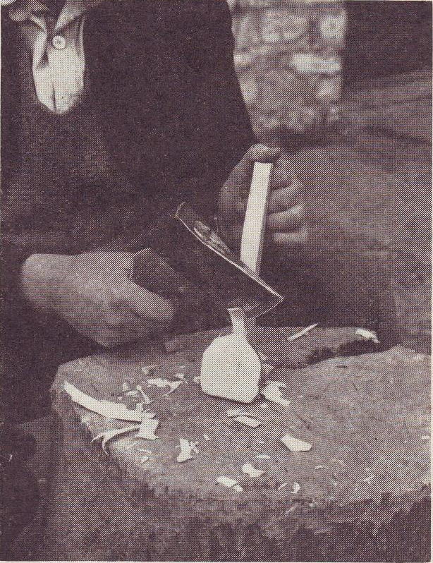 The bowl of the spoon is next hollowed out, and this is done with a home made hollowing knife (Fig 3). The knife used for making broth spoons has a handle 18 in. long with a small curved blade no more than 3 in. long. It is made from an old file and is always kept very sharp. The knife required for smoothing ladles is bigger with a blade 5 in. long. The long handle of the knife is tucked under the craftsman's arm, the blade firmly grasped with the hand and with a few sweeping actions of blade and arm the core of the bowl is removed, Considerable pressure is exerted at this stage for the core has to be removed cleanly and smoothly.